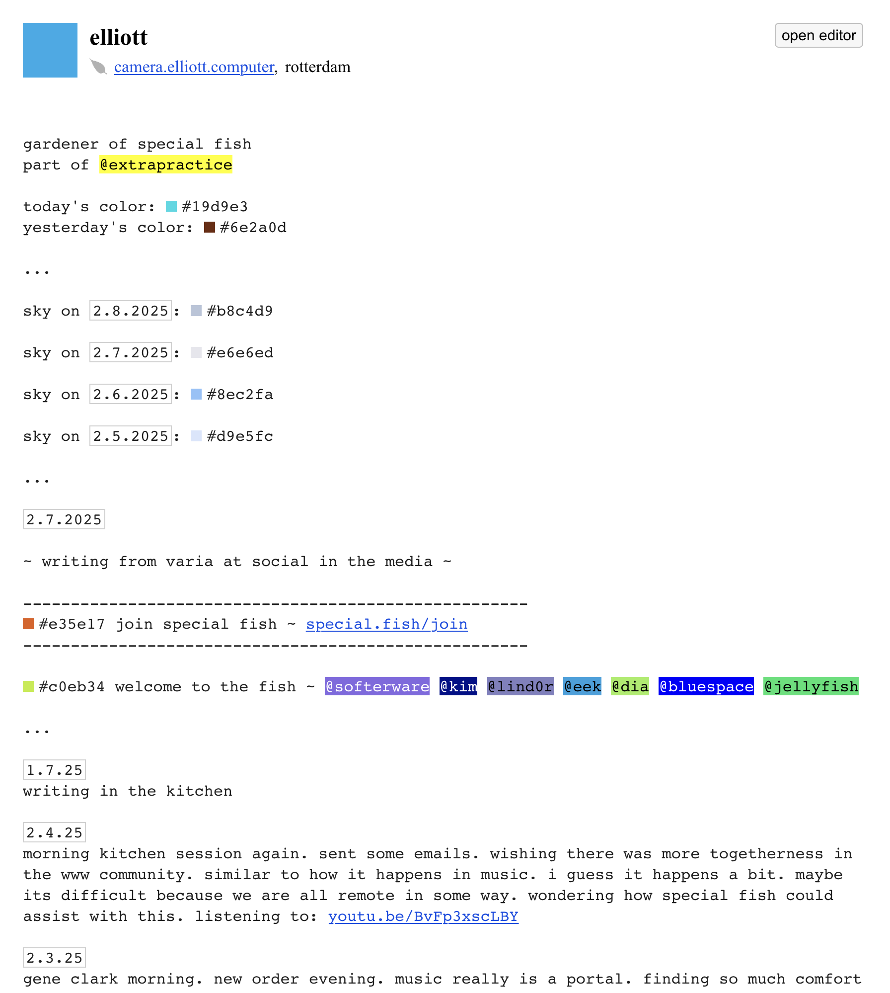 Mentioning a user e.g. @goldfinch links their handle and adds their profile color. It also adds a mention to their account (no notifications).